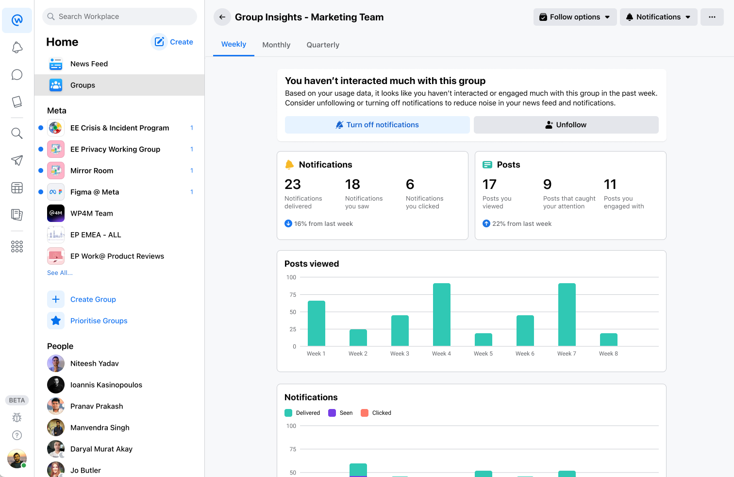 Enable effective collaboration and communication between Meta team members by bringing all important pieces together in a high signal surface and reduce the long list of unimportant stuff when teams need to be focussing on work.