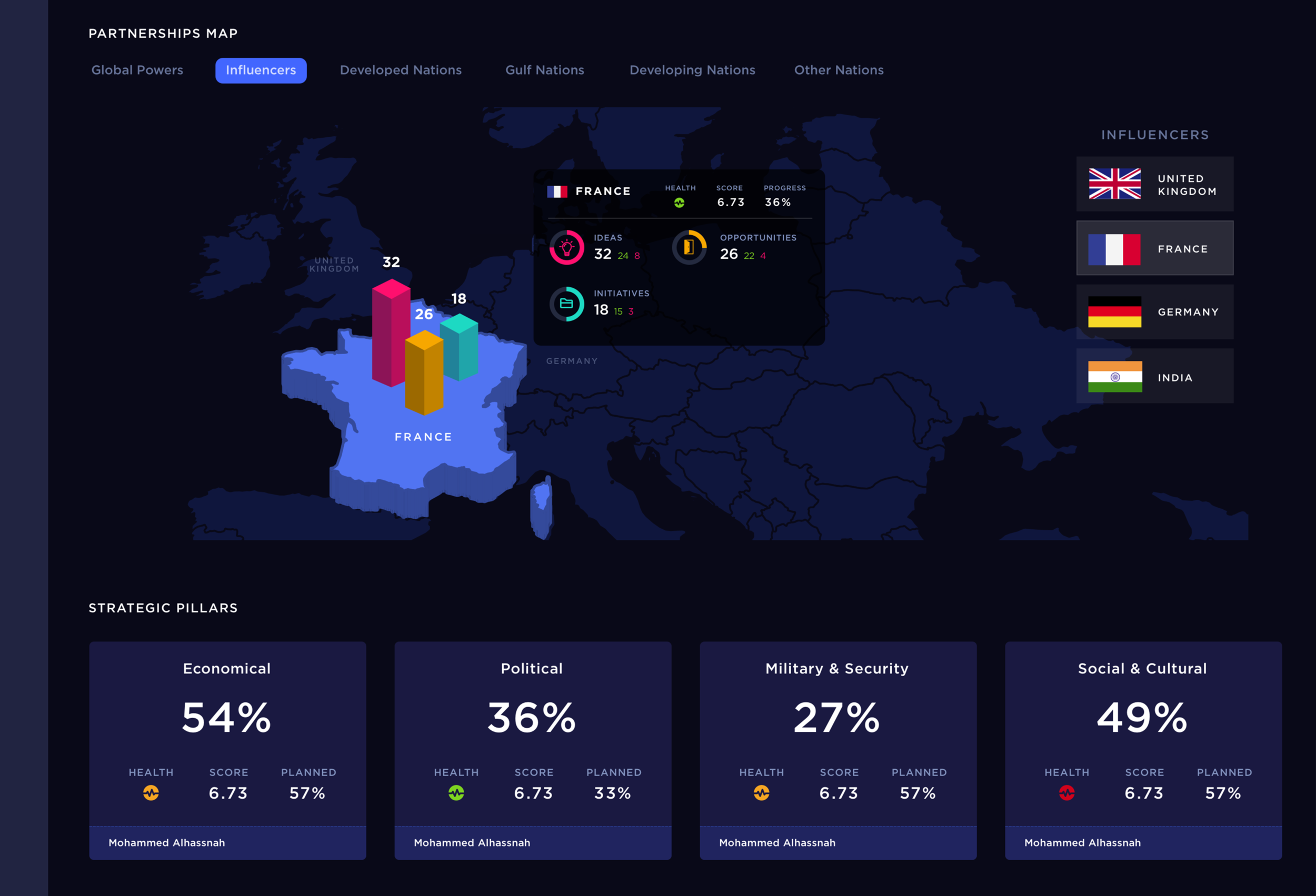 Partnership map showcasing top stats for each country categorised by development level, and drill-down of strategic pillars.